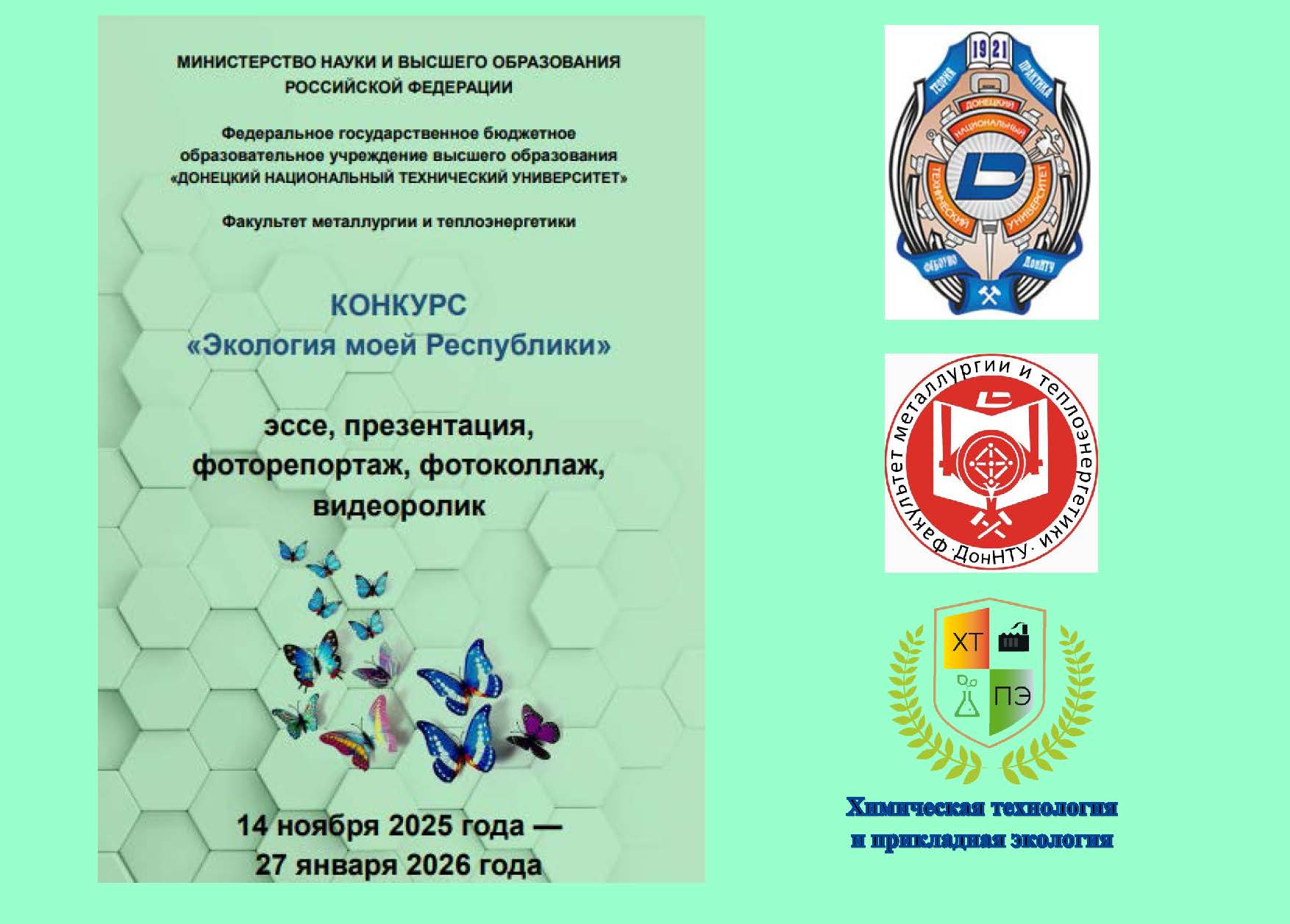С 14 ноября 2025 года по 27 января 2026 года кафедра «Химическая технология и прикладная экология» факультета металлургии и теплоэнергетики Донецкого национального технического университета погрузилась в мир творчества и экологической мысли. Мы запустили республиканский конкурс «Экология моей Республики» среди школьников, и то, что произошло дальше, превзошло все наши ожидания!